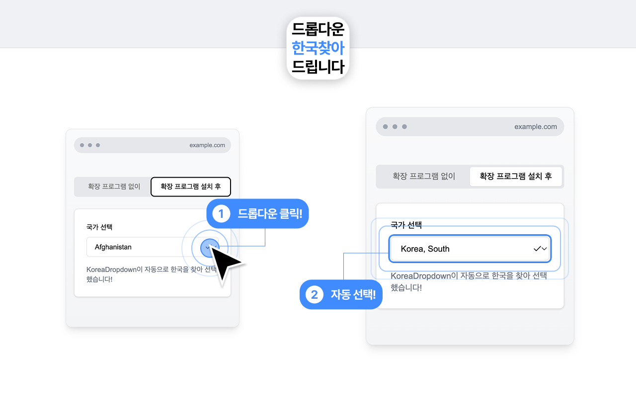 드롭다운을 열었을 때 한국에 해당하는 옵션을 자동으로 찾아 선택하는 브라우저 확장 프로그램을 만들었습니다.